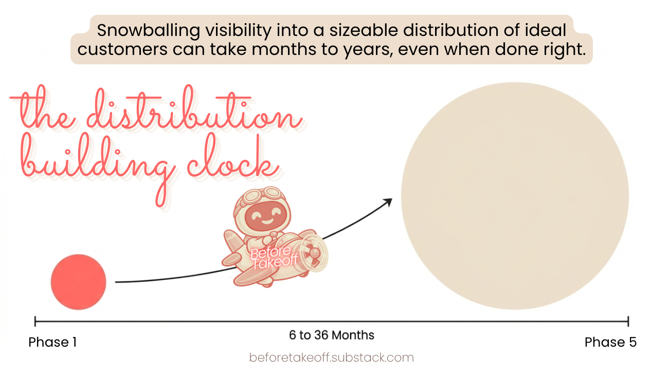 The second is imposter syndrome. Especially for founders who come from technical backgrounds or senior roles in their corporate career, online visibility feels like tacky self-promotion. They would rather let their work speak for itself. So they delay visibility activity until their product feels perfect or complete. But it takes time to create an effective system of turning visibility into a sizeable distribution. Just because you showed up online and posted content sometimes, doesn’t mean you’ll get enough of your target market to know, like, and trust you.