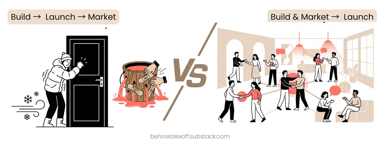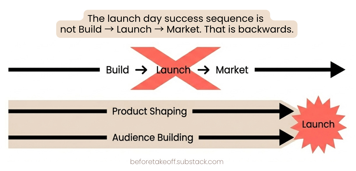 Most founders think the sequence is Build → Launch → Market. That is backwards. The true sequence requires you to show up before you feel ready, and stay visible while the product is being shaped.